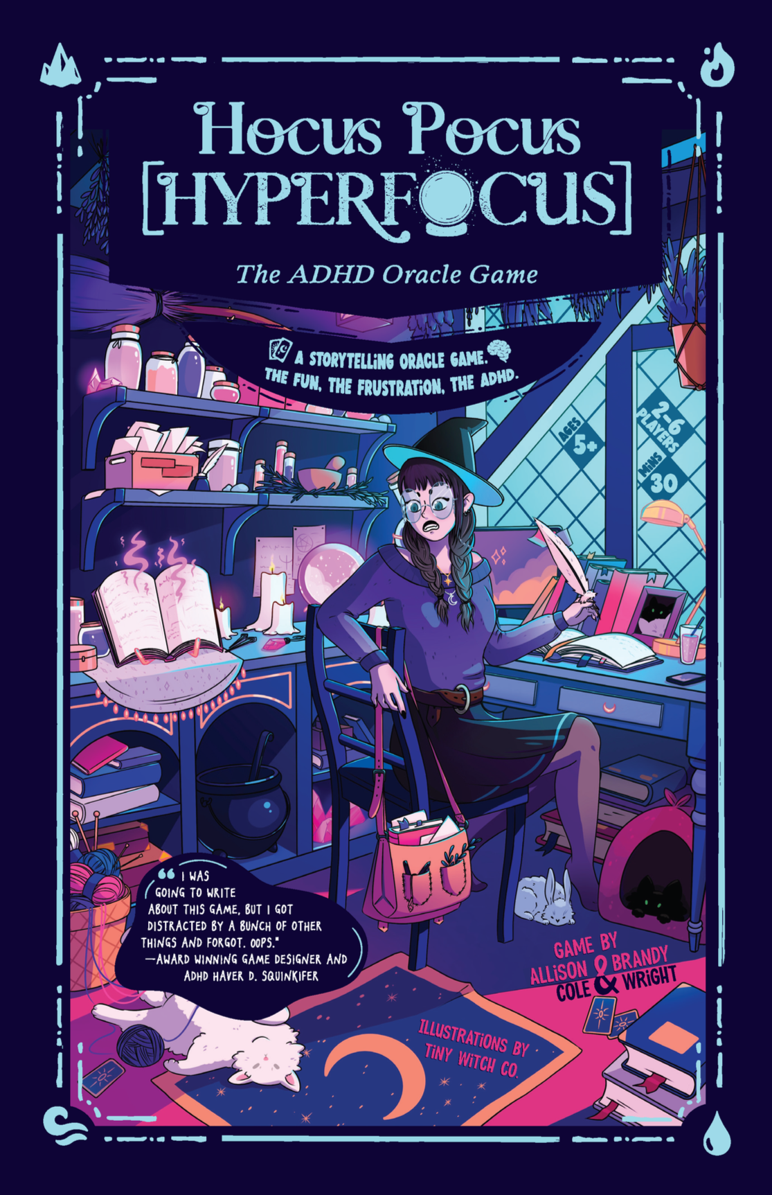 Tell tales of hectic days and total chaos, as your Witch works through both mundane and magical. Draw from the oracle Deck of Distractions, letting each card inspire you as you unfold the story of how your Witch’s mind wanders. And whatever you do, don’t get distracted…
